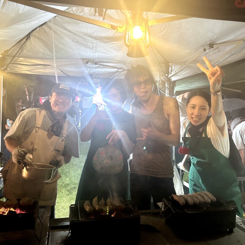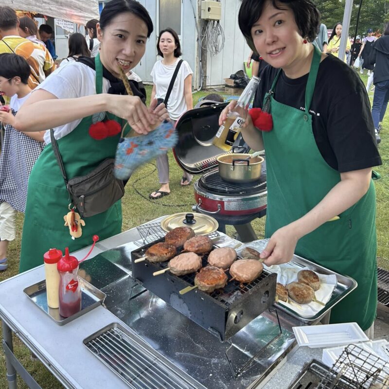 炭火で自家製のハンバーグとフランクフルトを焼く係です!